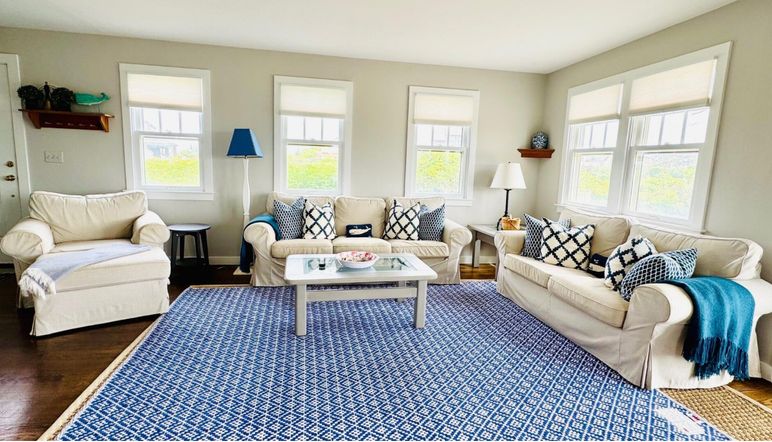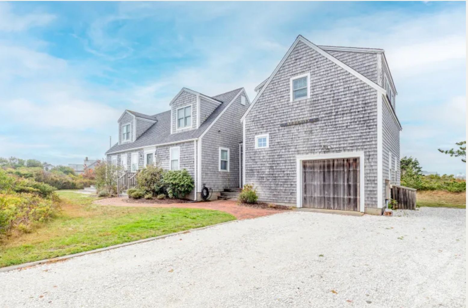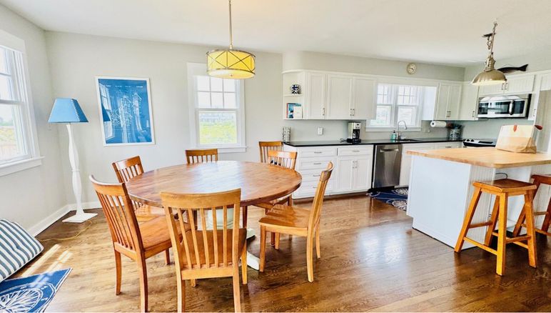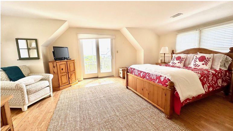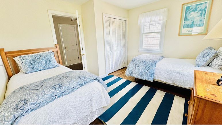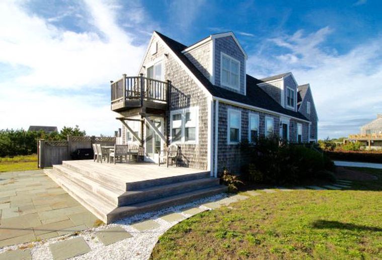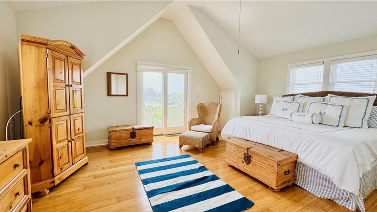 This Nantucket summer rental is a darling, modified Cape, close to Cisco Beach with water views from both floors. Open design first floor with kitchen, dining area and living area opening onto a spacious deck and patio. Butcher block island in kitchen with counter and stools for family gatherings. First floor also has a laundry room, shower/bath and a twin bed bedroom. This house features two master suites on opposite ends of the house, both with balconies and waterviews. One master has a private bath and a queen bed. The other master has a king bed and shares a tub bath with the 4th twin bedroom. Cisco Beach is a three minute walk away.