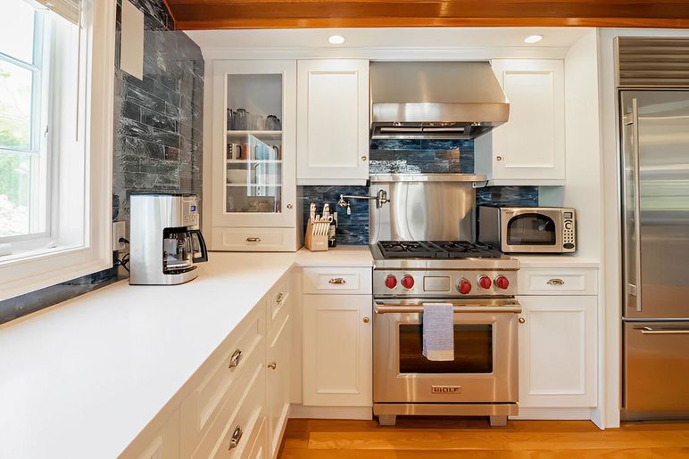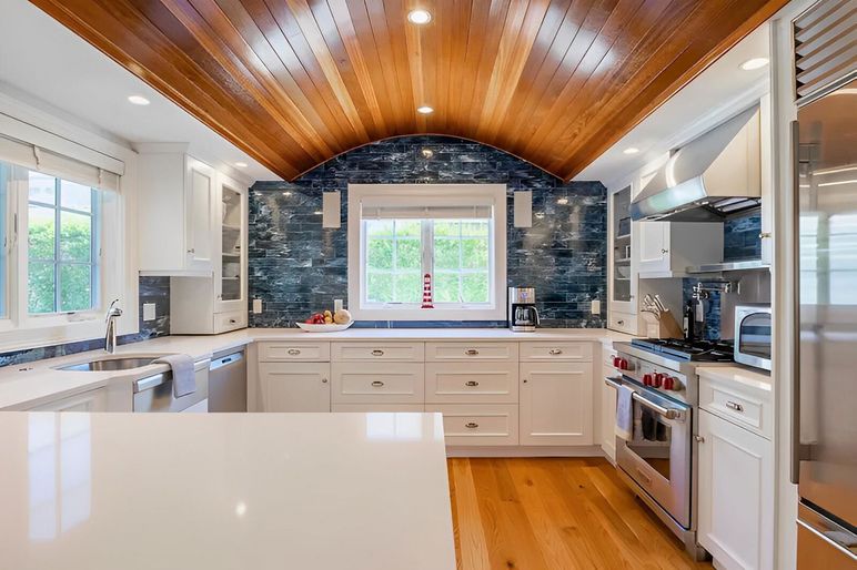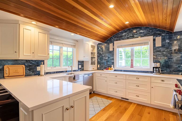 Through the front door, there is a gracious front foyer. To the left there is an office. To the right is a Queen bedroom with full bath, as well as a half bath and coat closet off the front hall. Continuing on leads you into a Great room featuring a living area with vaulted ceilings, built-in bookshelves and fireplace. There is a dining area with a table to seat 8-10 guests. The kitchen features an arched teak ceiling, small wine bar and wine mini-refrigerator, and stainless appliances including a gas Wolf stove. Just past the living area is the second Queen bedroom with fireplace and full shower bath. There are French doors off the living area that bring you out onto the covered side deck. Out back is a stone patio with room for lounging and dining, small yard, and very large outdoor shower. Gas grill connected to house propane system. Exterior stairs to the lower level.