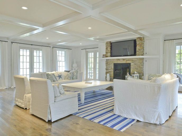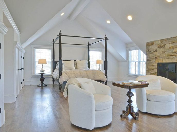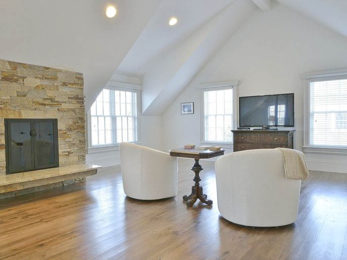 The first floor provides ample space to gather together in the great room, which includes the dining area, large kitchen with high-end appliances, granite counters, island with bar seating, custom cabinets, access to grilling on the side deck, and living room with fireplace and French doors to the back deck. A large laundry room, powder room, and den complete the first floor.