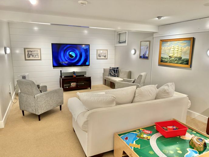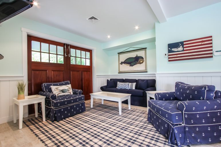 The foyer opens into a great room with kitchen, living room with flat screen TV, and dining area seating 8. Powder room. Office with sleep sofa and full bathroom can be used as an extra guest bedroom. Spacious covered porch overlooking a beautifully manicured yard and pool. Two outdoor dining areas, outdoor fireplace with ample seating. Lower level: Large play room with sleep sofa and big flat screen TV (this play room accounts for the two additional sleeping #'s). Two guest bedrooms (Twins and Queen) with a full hall bathroom.