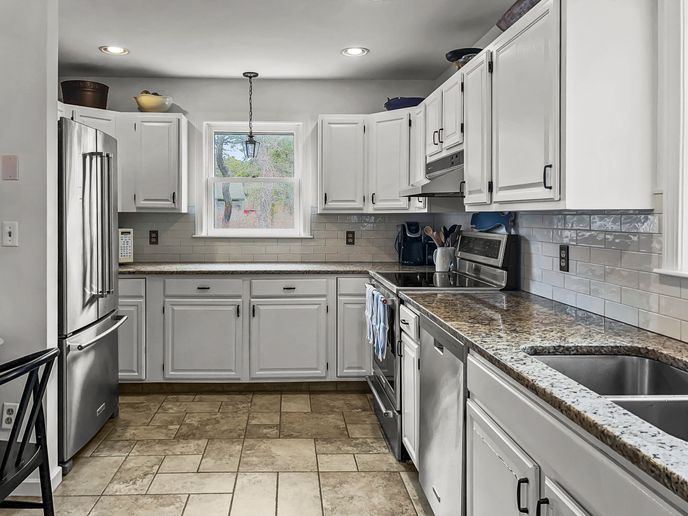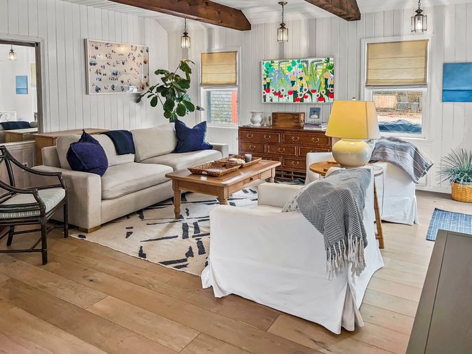 Open floor plan featuring a gorgeous post and beam living space and a well appointed chef's kitchen. A short hallway leads to a guest bedroom with queen bed with an adjacent bath with oversized shower. Access the sunlit deck and lovely brick patio and outdoor shower from the living room.