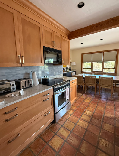The open kitchen, living, and dining area features a recently updated kitchen with granite countertops and a new stove, a dining table with seating for ten, and a comfortable, light-filled living space - perfect for relaxing after a day at the beach.