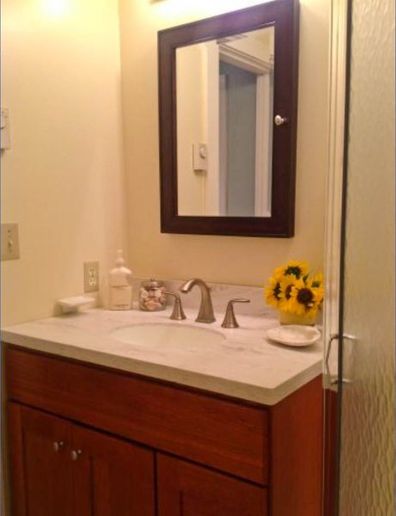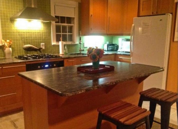 There is an eat in kitchen, a den with double futon and a bath with shower.