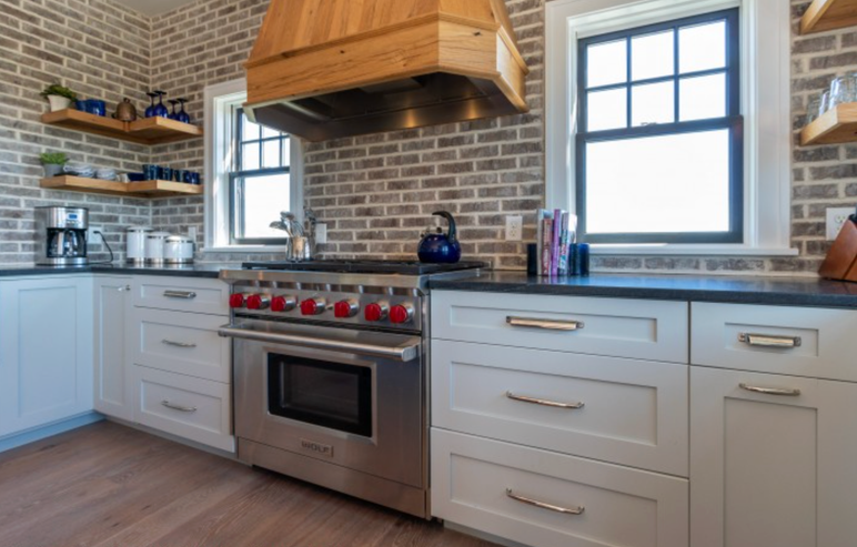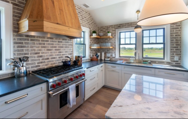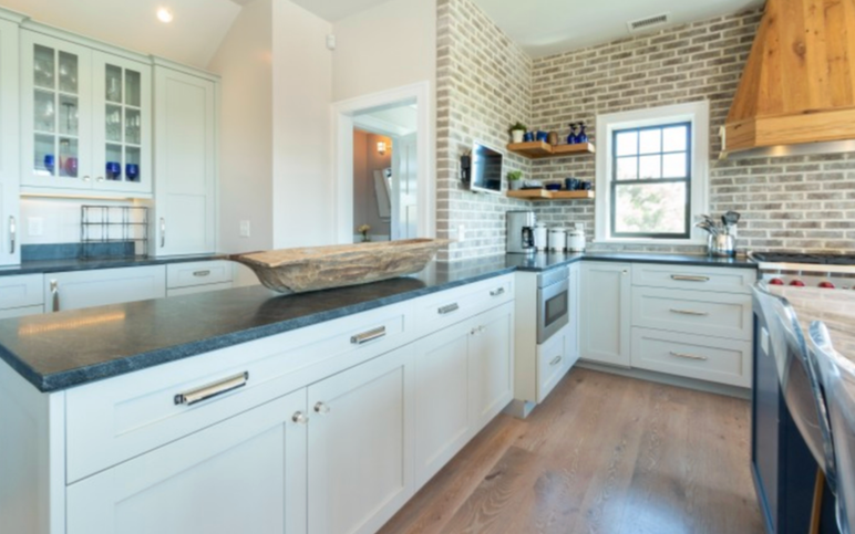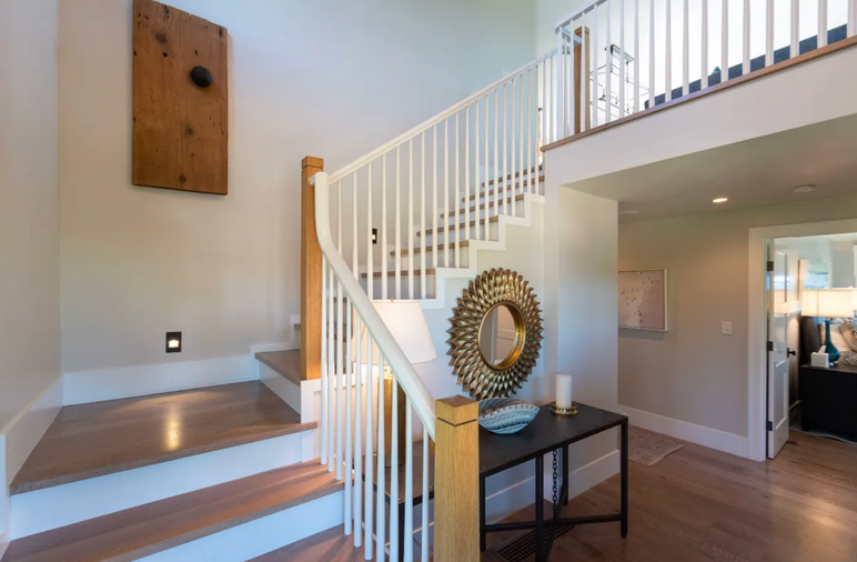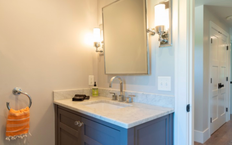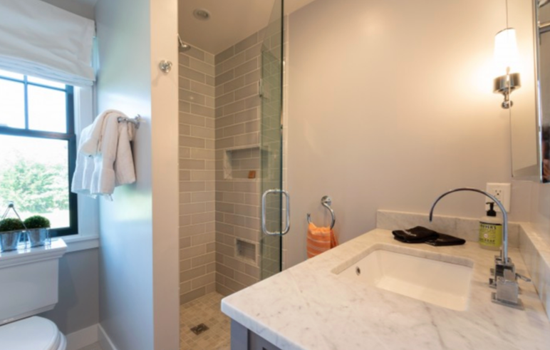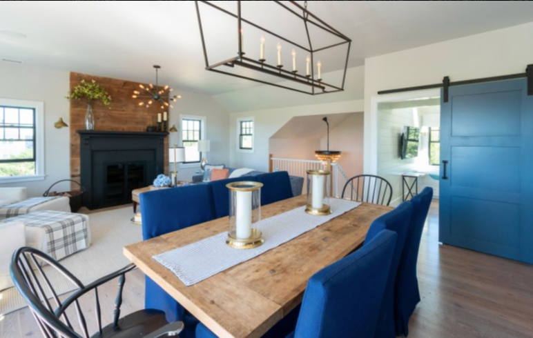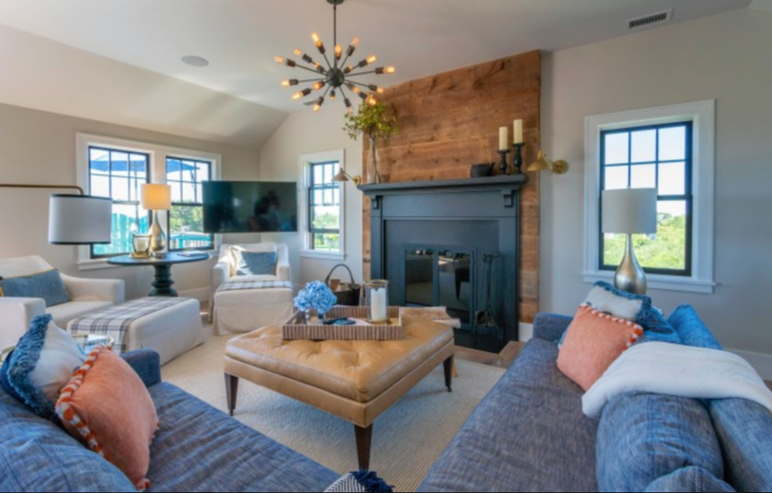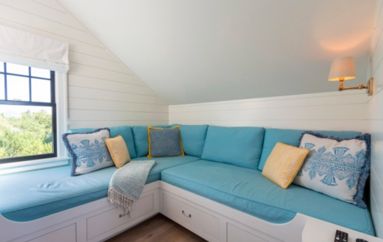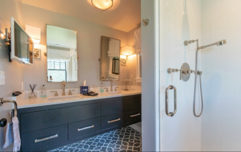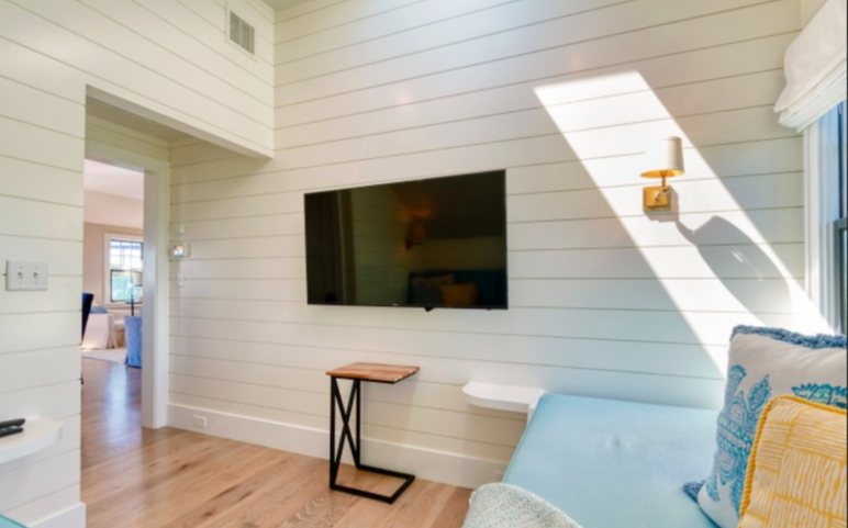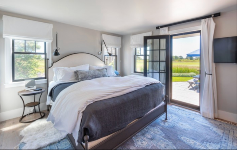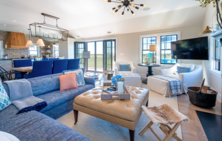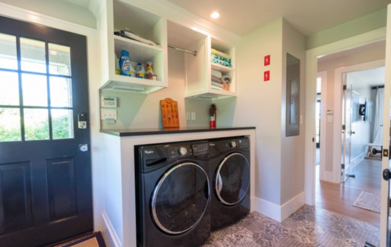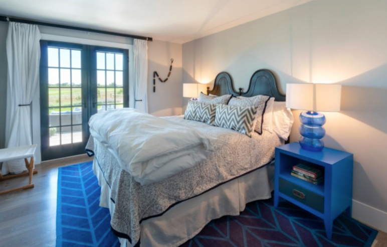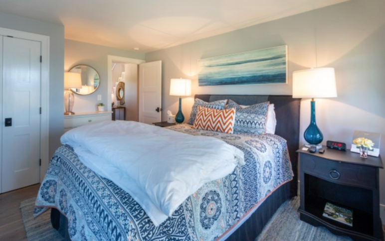 The primary bedroom has a king bed with en-suite bath, two guest bedrooms each with a queen bed and a shared hall bath, laundry/mud room