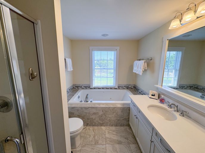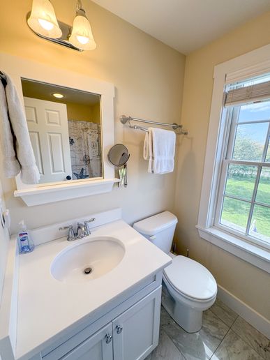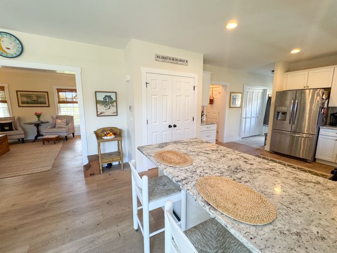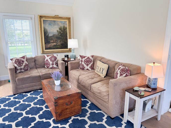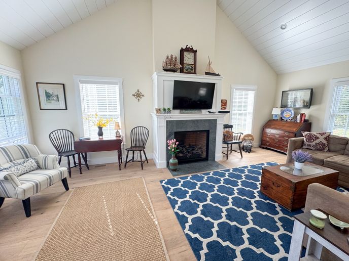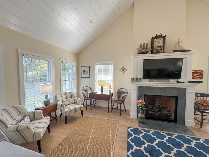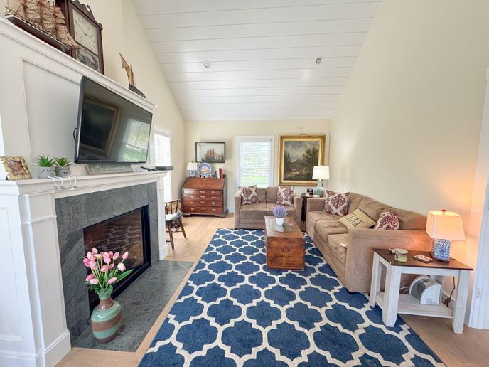 The front door leads to a large foyer with a comfortable sitting room, perfect for reading a book. There is an open kitchen/dining room with seating for eight at the diner table. Bar seats two. Slider allows plenty of light to get in and leads to a large deck with private back yard. Separate living room with gas fireplace, TV and game table. The small den/bedroom has a day bed and TV. Full bathroom and laundry area.