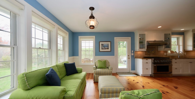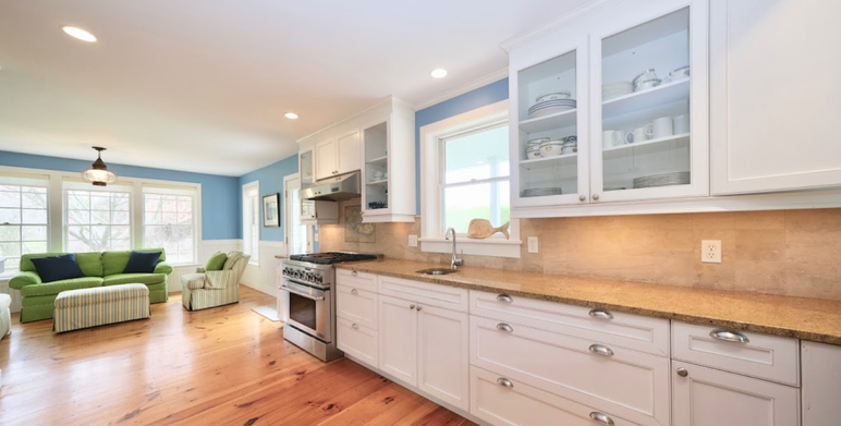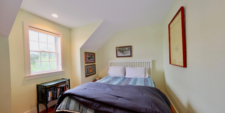 A spacious covered porch leads into a warm and inviting living room with a fireplace, opening into a light-filled sunroom. The gourmet kitchen is equipped with updated appliances and a cozy sitting area, and looks out over a dining room that comfortably seats up to 10 guests. This floor also includes a half bath and a laundry room with a new washer and dryer.