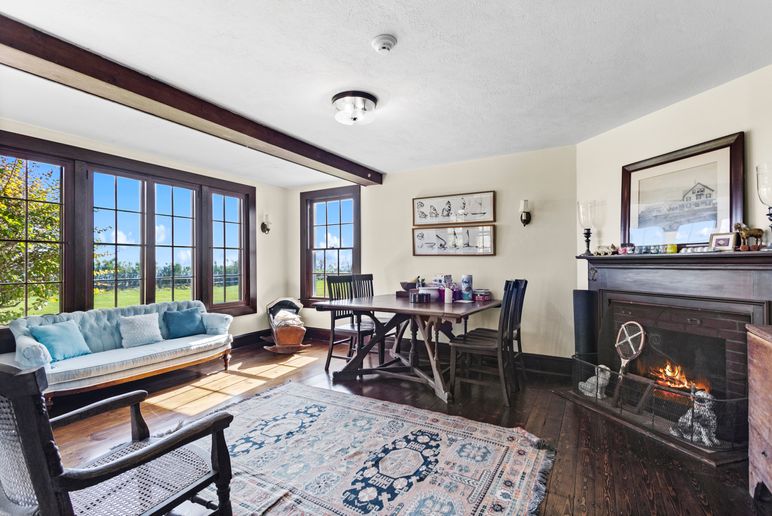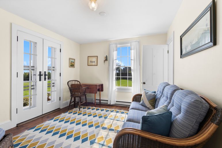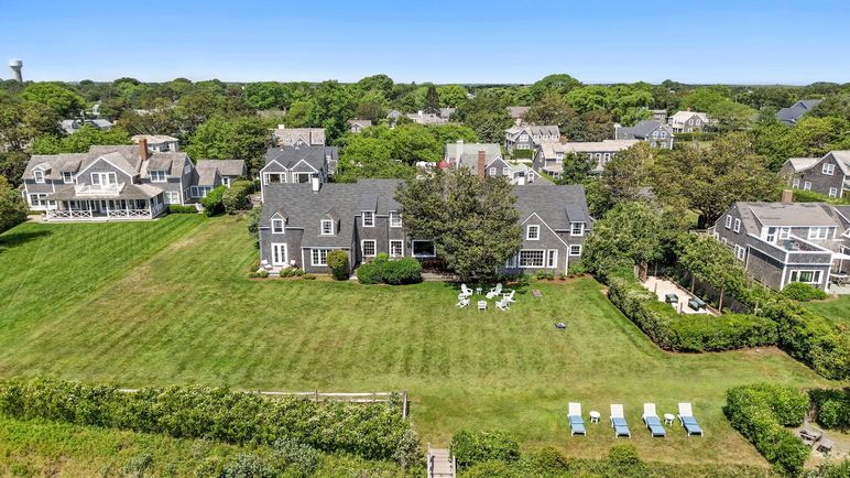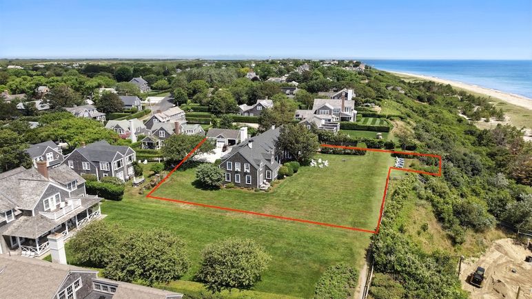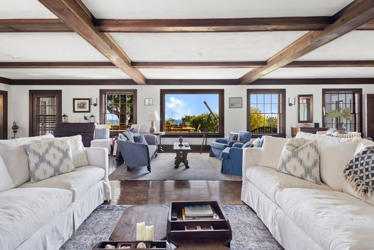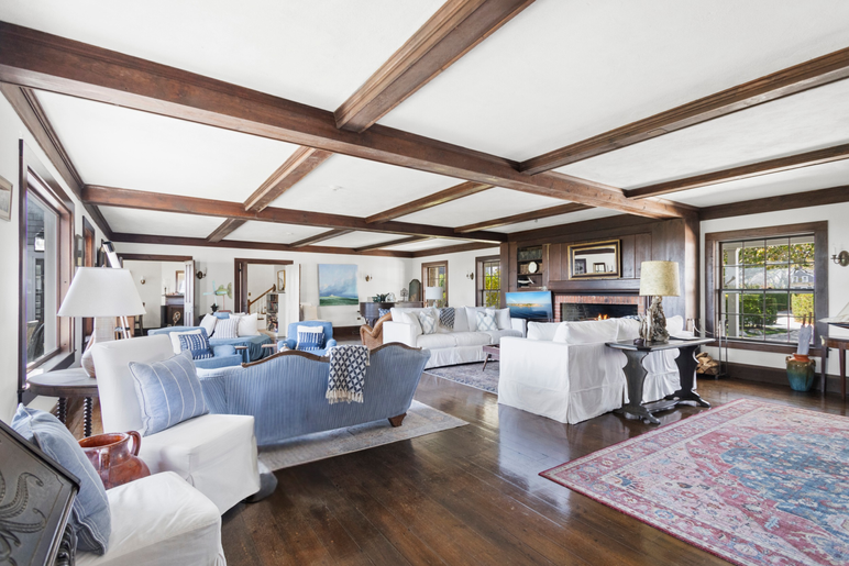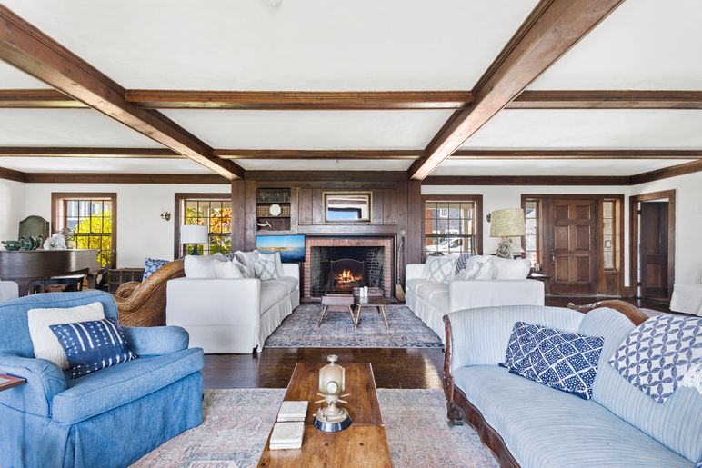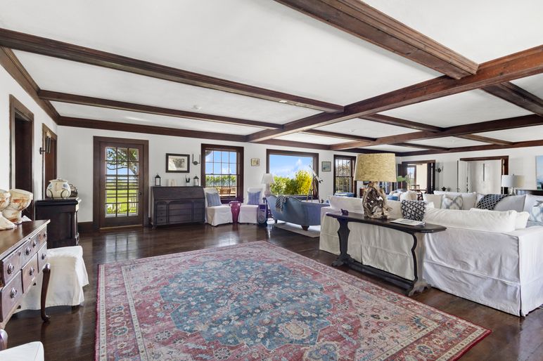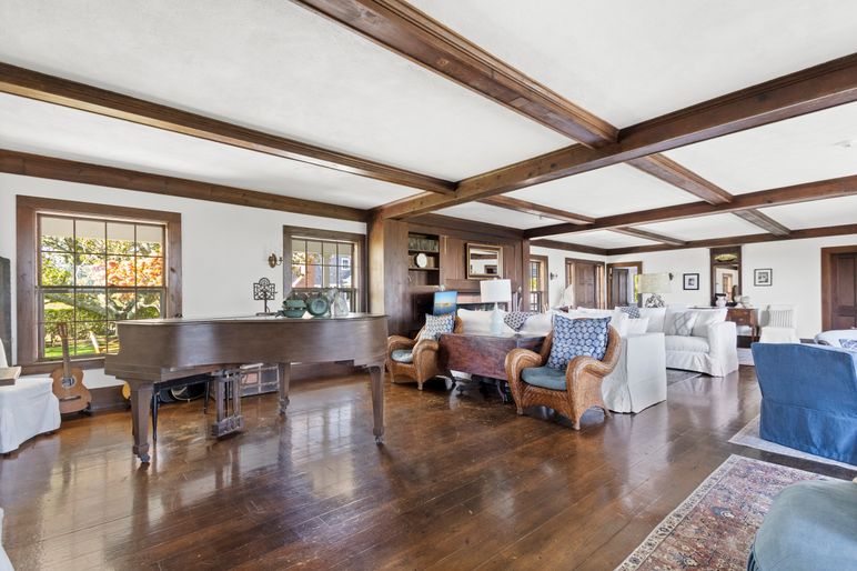 Enter into the grand living room with picture windows looking out to the spacious lawn and ocean beyond. To the left of the living room is an office, the kitchen, and dining room. To the right is a sitting room, a first floor master suite with sitting room and separate bedroom and hall bath.