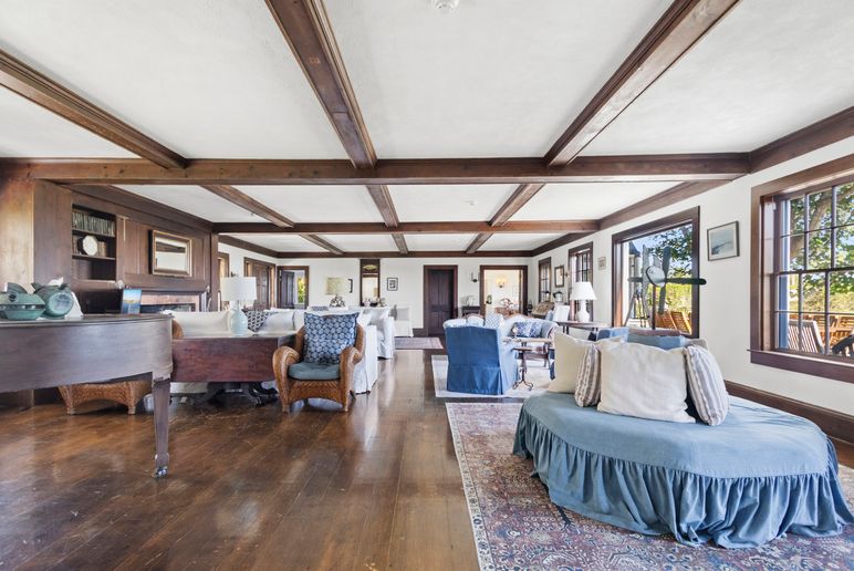 The great room boasts a grand piano and a working fireplace, has huge picture windows with sweeping views of the Atlantic ocean.