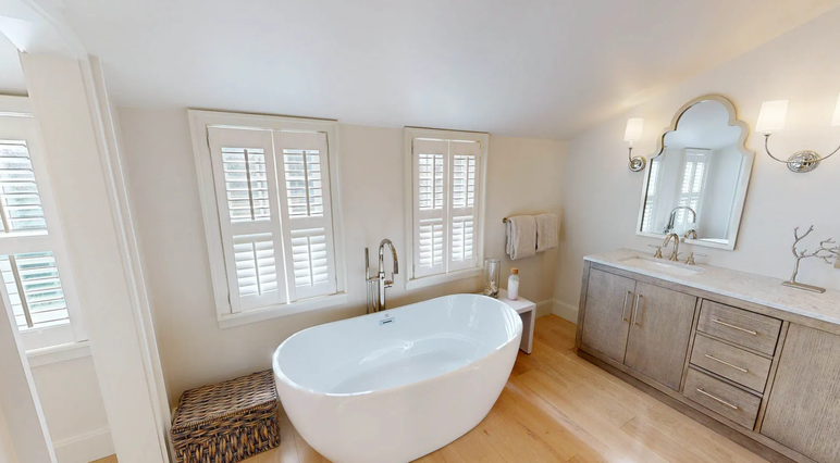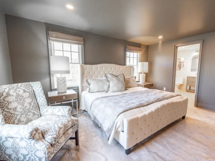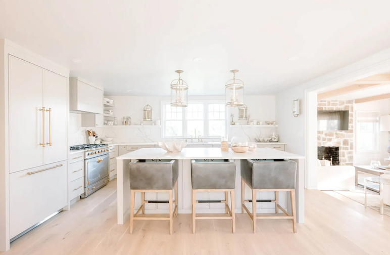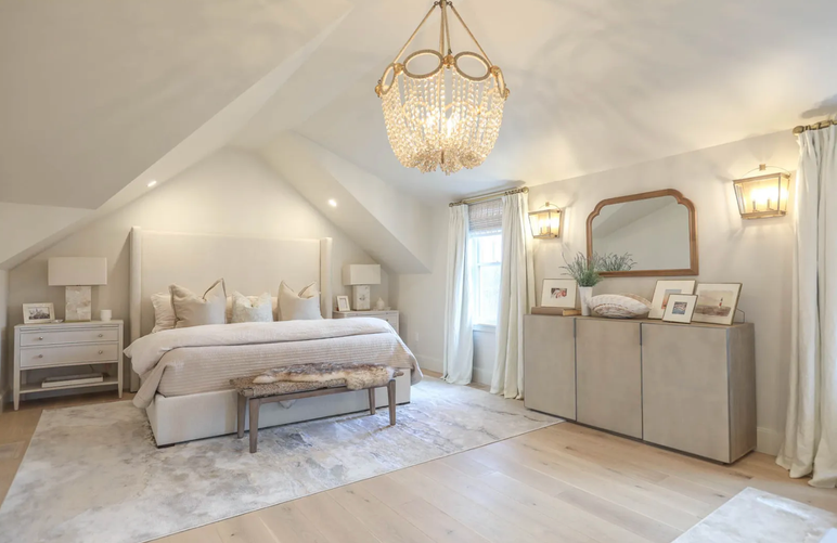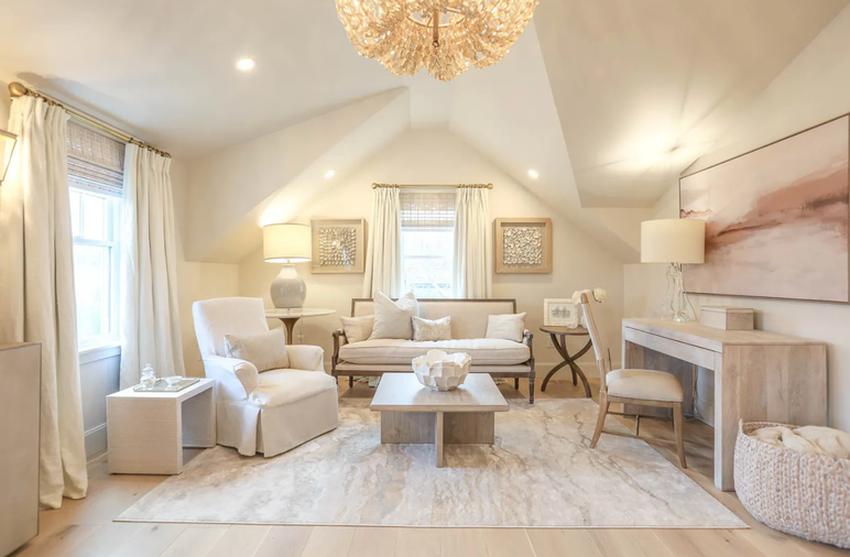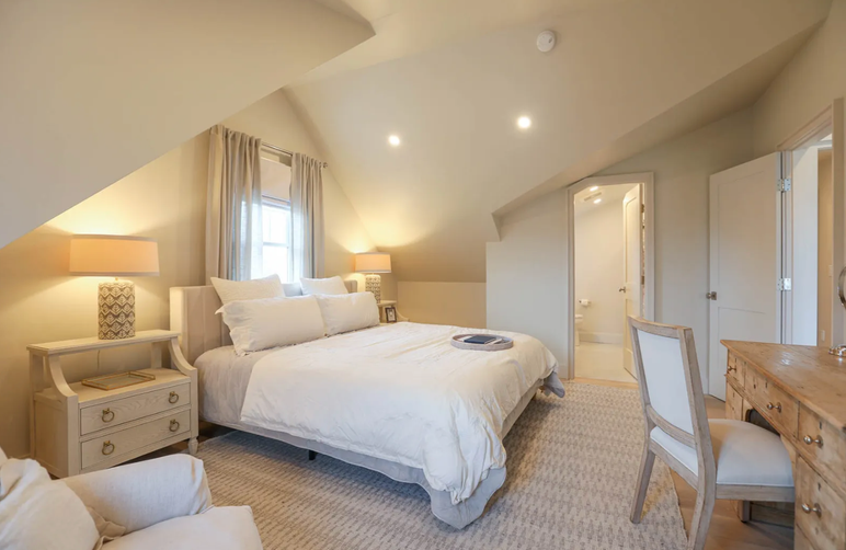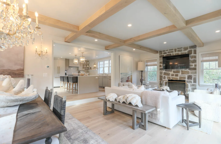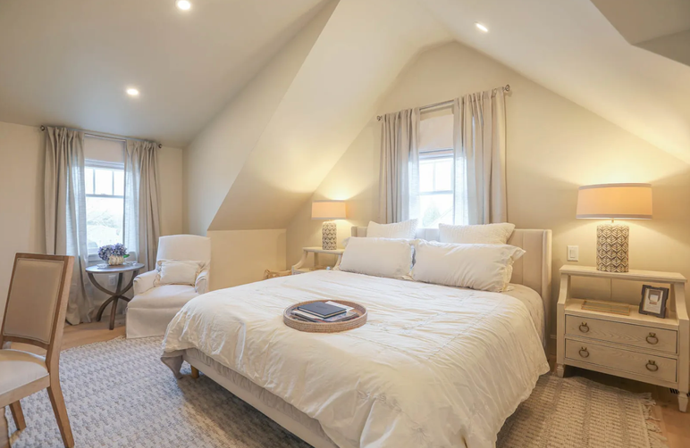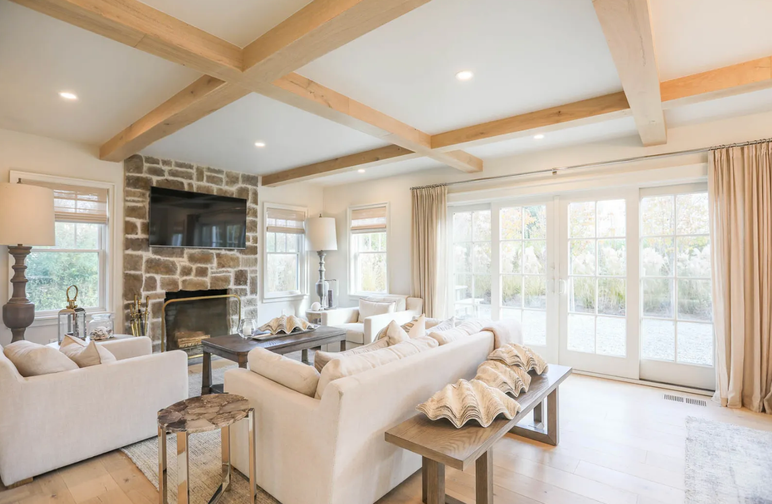 Enter the first floor and follow the sightline past the kitchen and into the beautiful living room. Upon entry the stairs are to your left and an office is to your right. The first floor offers a first-floor suite which has a king size bed. There is a half bath and mudroom with laundry. The kitchen is all that you could ask for with a La Cornue range, two dishwashers and a spacious island. There is additional seating in a cute breakfast nook. The stepdown living room focuses on the stone fireplace with ample seating. This room also has the dining table with seating for eight people and large French Doors leading to the outdoor living space.