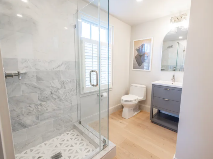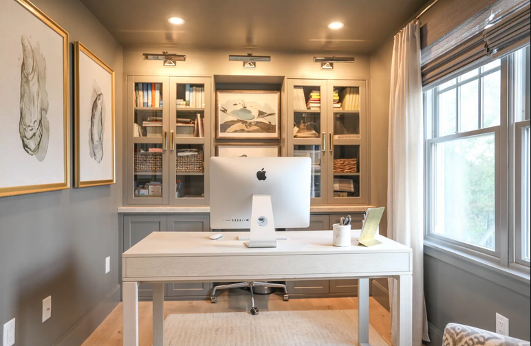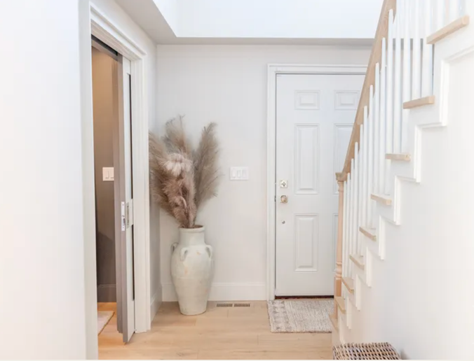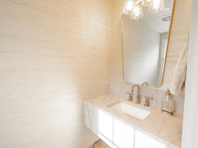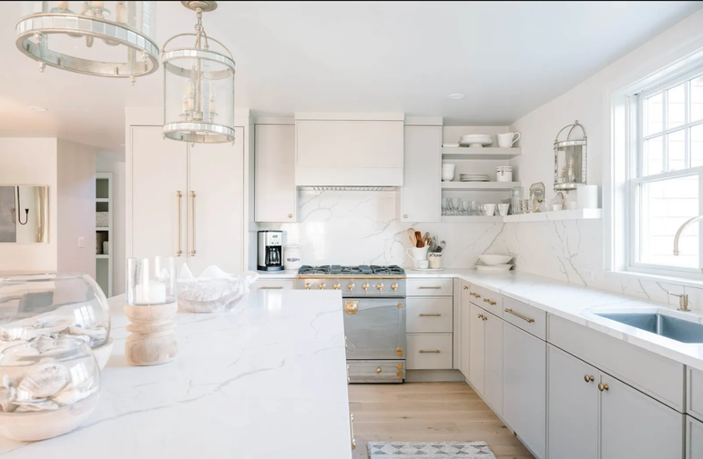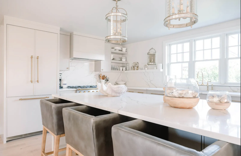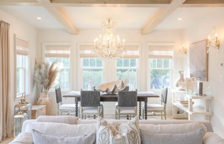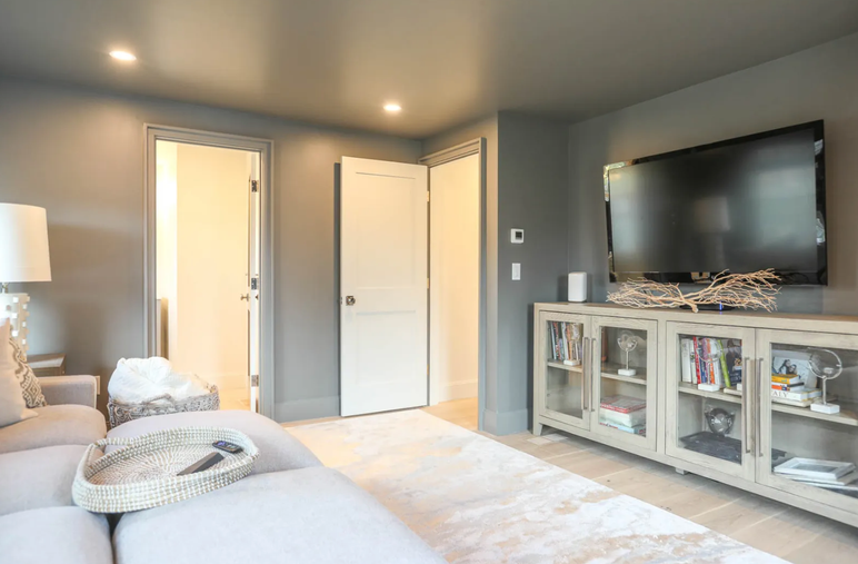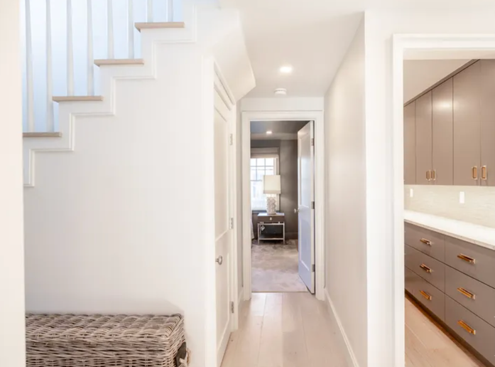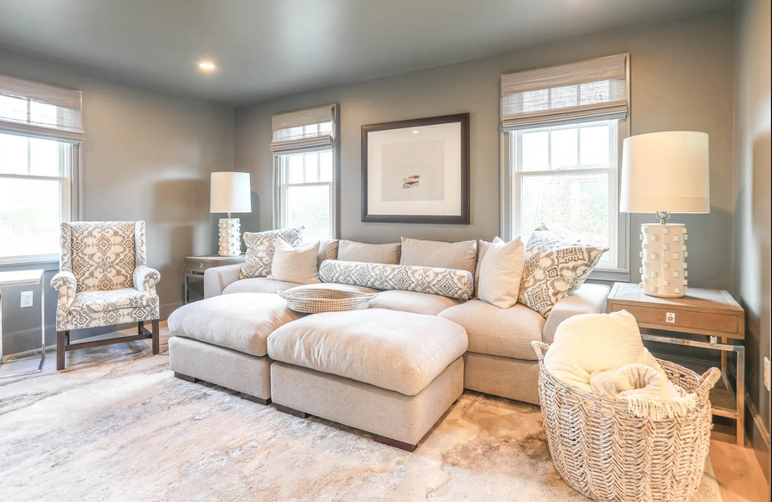 Enter the first floor and follow the sightline past the kitchen and into the beautiful living room. Upon entry the stairs are to your left and an office is to your right. The first floor offers a first-floor suite which has a king size bed. There is a half bath and mudroom with laundry. The kitchen is all that you could ask for with a La Cornue range, two dishwashers and a spacious island. There is additional seating in a cute breakfast nook. The stepdown living room focuses on the stone fireplace with ample seating. This room also has the dining table with seating for eight people and large French Doors leading to the outdoor living space.