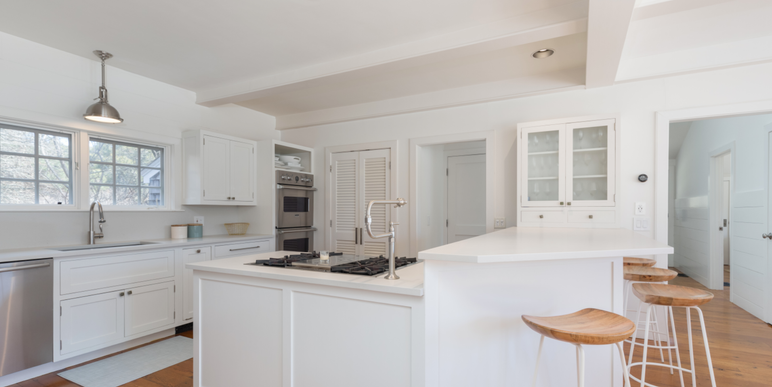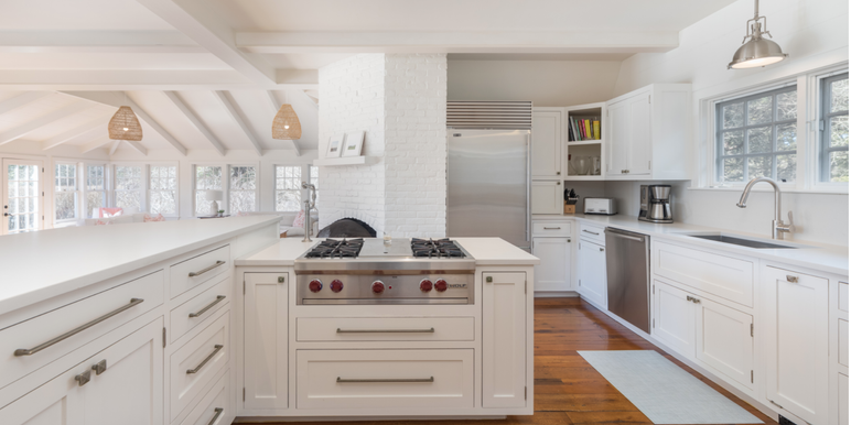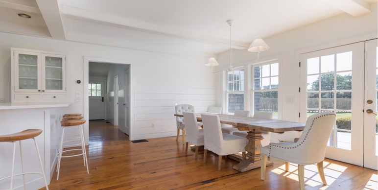 Renovated in 2019, Caulfield House showcases a bright and beautifully appointed kitchen with white Caesarstone countertops and premium appliances, including a double Viking wall oven with warming drawer, six-burner Wolf gas cooktop, Sub-Zero refrigerator, Sub-Zero undercounter wine fridge, and a whisper-quiet Miele dishwasher. The kitchen flows seamlessly into a welcoming dining area, where French doors open to the pool, expansive mahogany deck, and bluestone patio—ideal for indoor-outdoor living and al fresco entertaining.