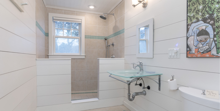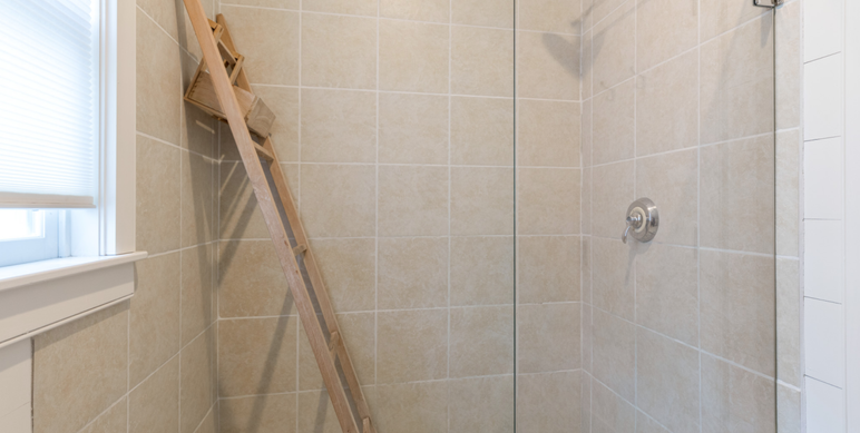 Just off the great room, a hallway leads to two first-floor bedrooms: one with a queen bed and the other with two twin beds. These bedrooms share a spacious full bathroom with a large walk-in shower, rainfall showerhead, and handheld shower for added comfort and convenience.