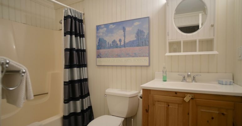 Open plan kitchen, with butcher block counter tops and stainless steel appliances, overlook dining and living room area decorated with charming antiques and a cobblestone fireplace. Two cathedral ceilinged bedrooms, full bath and laundry area. Lower level consists of a second entertainment and game room with TV and wet bar. Two bedrooms, full bath and separate entry.