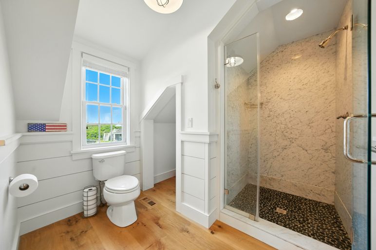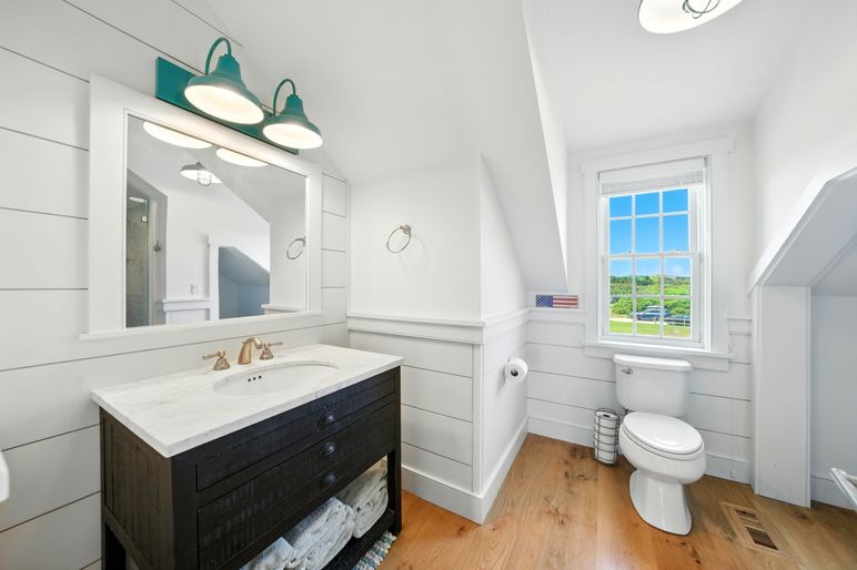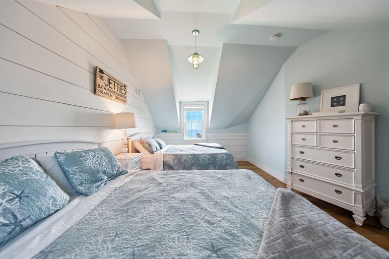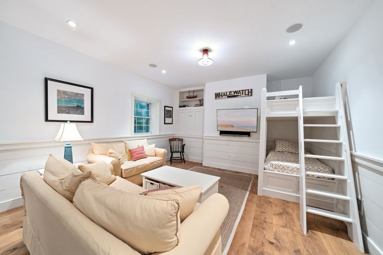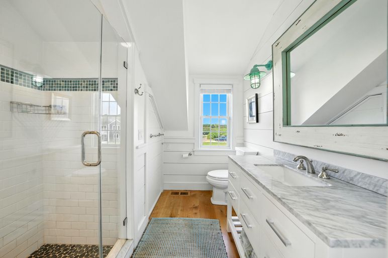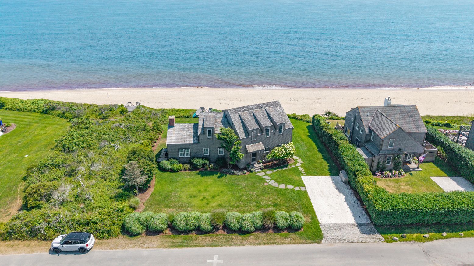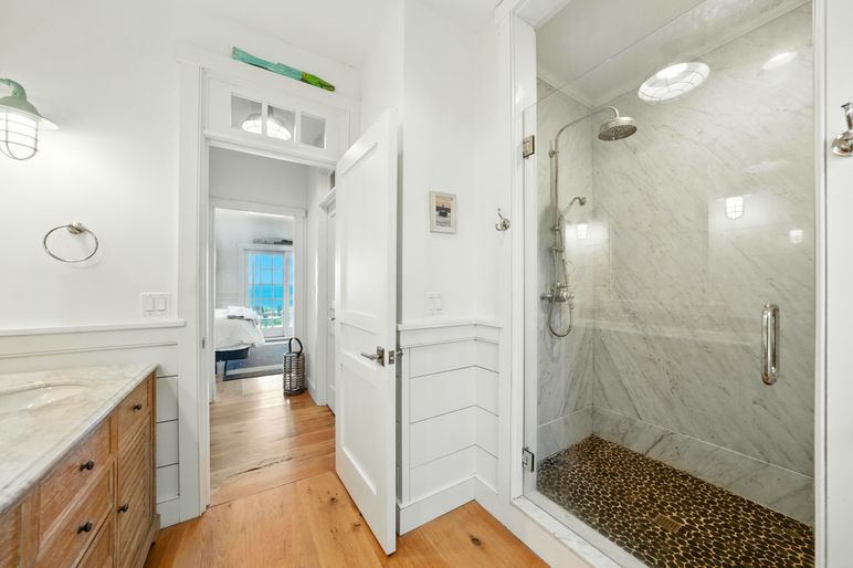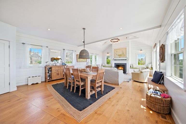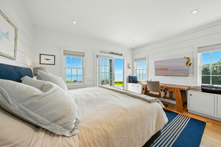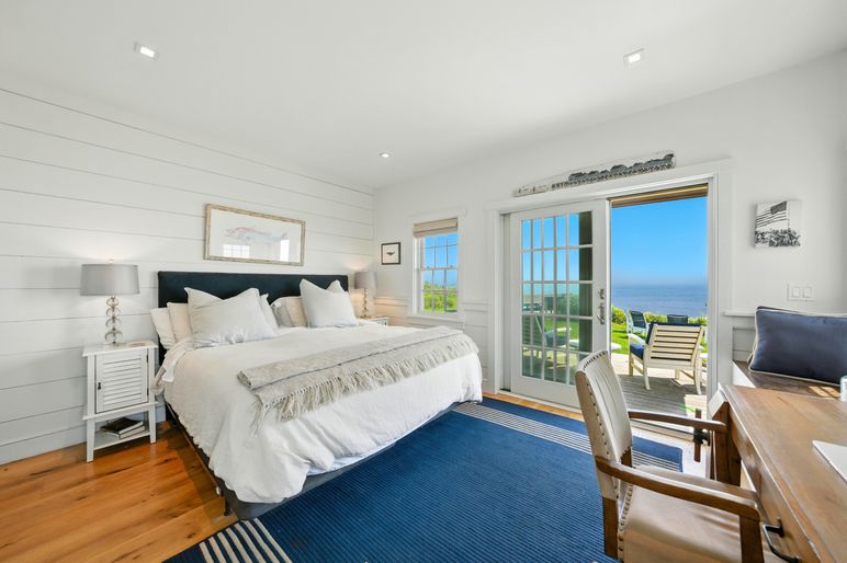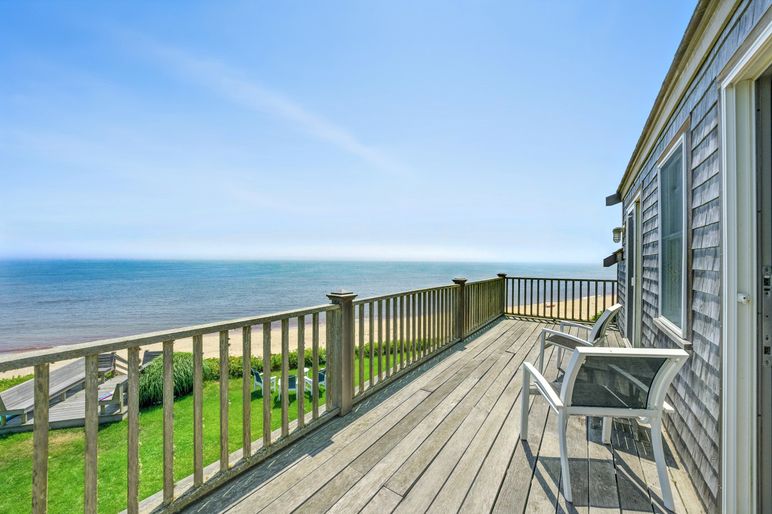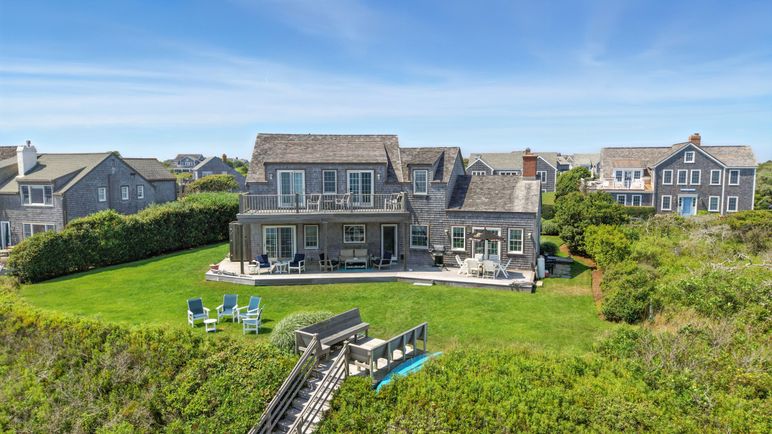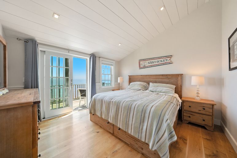 This exceptional coastal residence offers five bedrooms and four and a half baths, with sweeping panoramic views of the Atlantic Ocean. Thoughtfully designed for both comfort and style, the home features open living spaces, wide pine floors, and expansive walls of windows that frame the ever-changing seascape. Cathedral ceilings, abundant natural light, and direct beach access create the perfect setting for a quintessential Nantucket retreat.