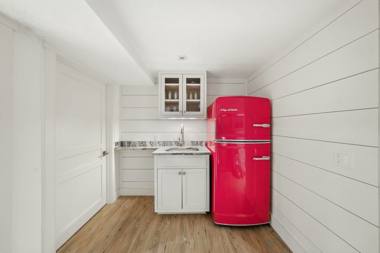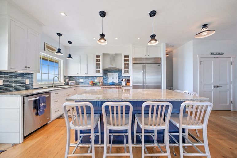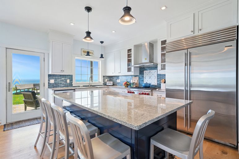 The main level is centered around an open-concept kitchen, dining, and living area, all showcasing stunning ocean views from every vantage point. The kitchen features a six-burner Wolf range, a 48-inch Sub-Zero refrigerator, and a generous center island with seating for five, blending functionality with elegant design. The cathedral-ceiling living room, opens via sliding glass doors to an expansive deck, creating a seamless indoor-outdoor flow. This level also includes the primary bedroom with en-suite bath, a powder room, and a laundry area.