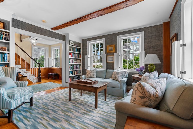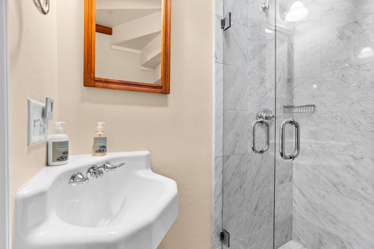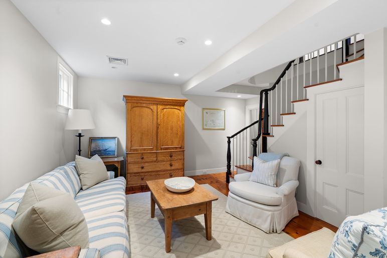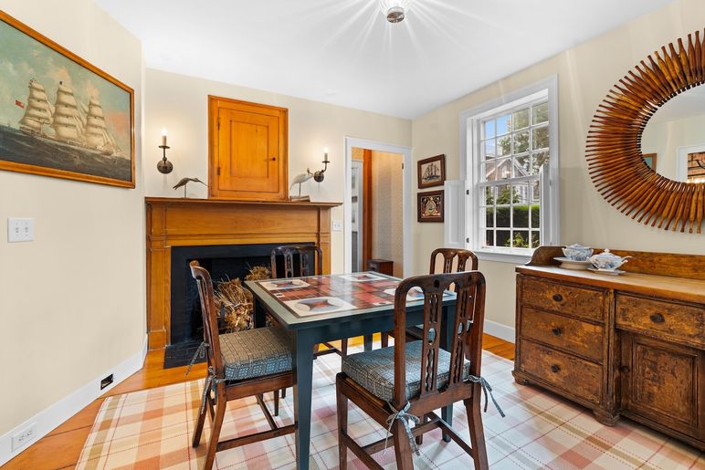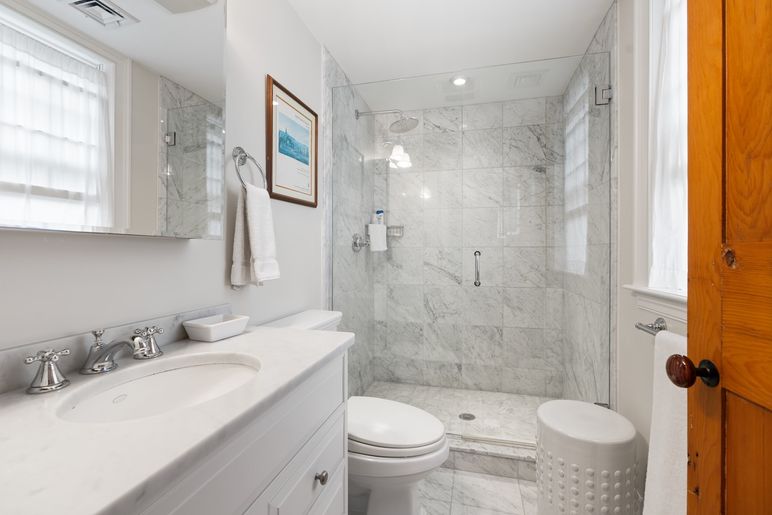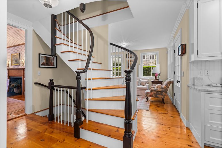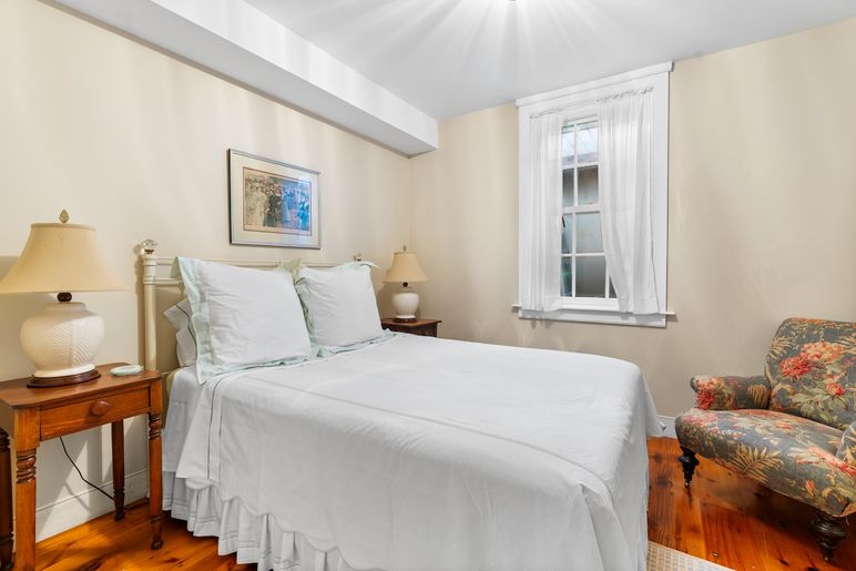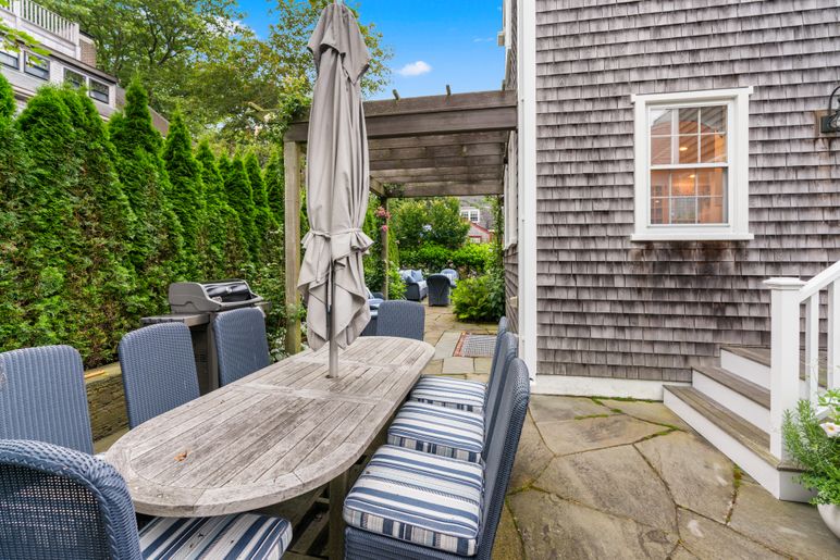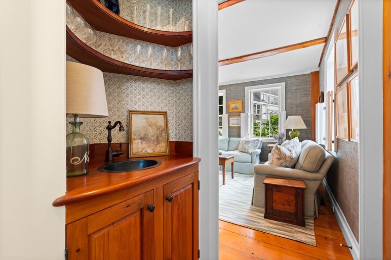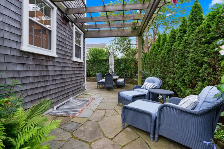 Enter through a gracious foyer that sets the tone with its original woodwork and timeless character. The front parlor offers a cozy place to unwind by the fireplace, while the adjoining second parlor opens to the dining room and modern kitchen — ideal for gathering after a day at the beach. The chef’s kitchen features high-end appliances, a large center island for casual dining, and a built-in bar perfect for entertaining. French doors lead to the private bluestone patio and pergola-shaded dining area surrounded by mature landscaping. A powder room and convenient side entrance complete this level.