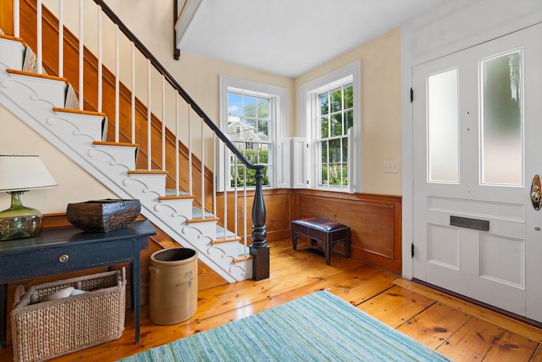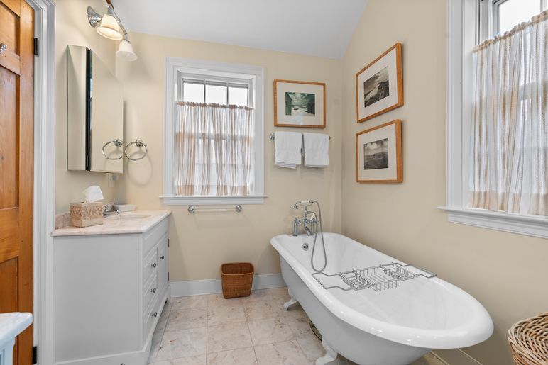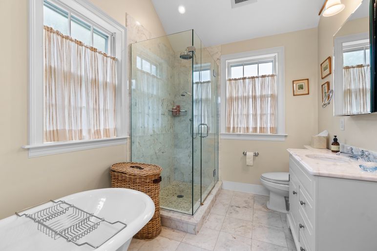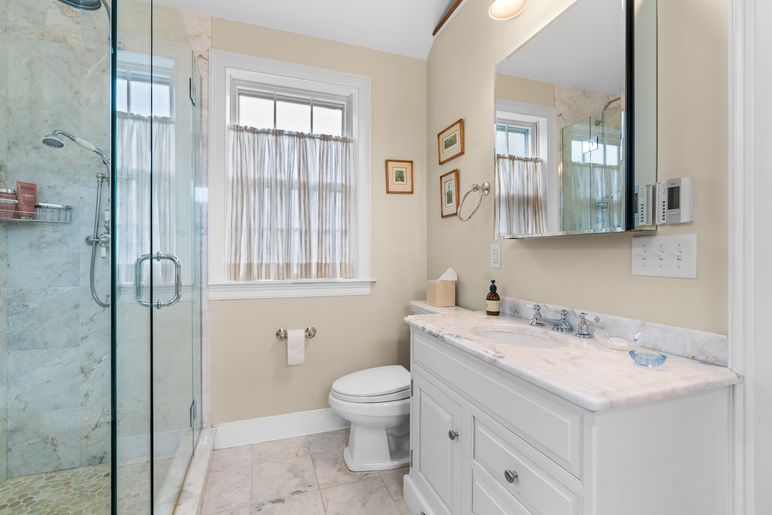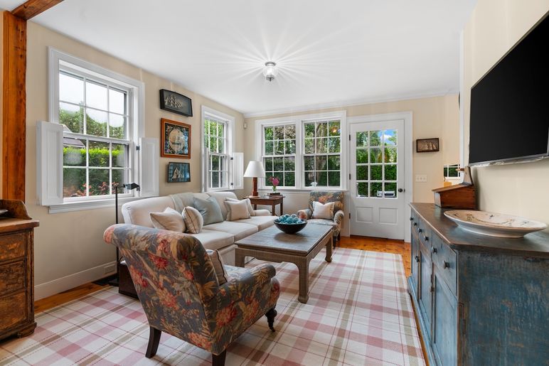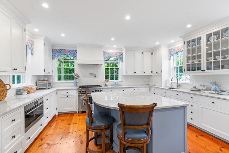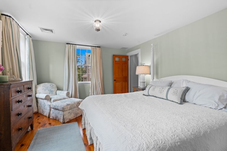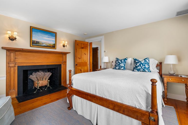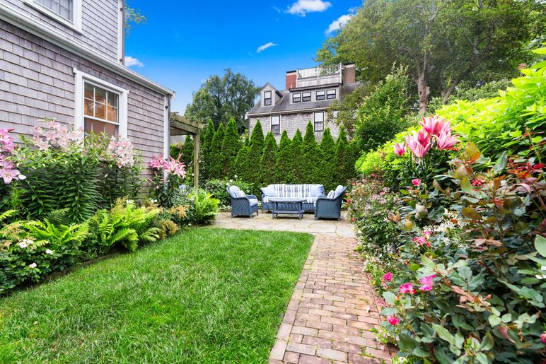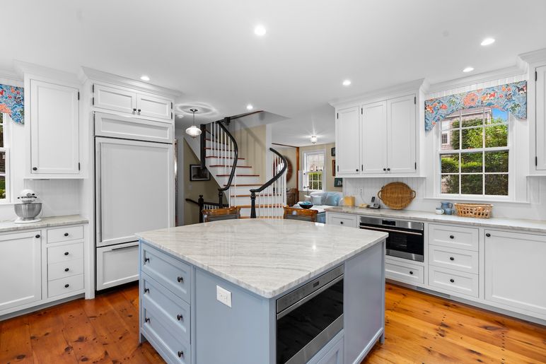 Enter through a gracious foyer that sets the tone with its original woodwork and timeless character. The front parlor offers a cozy place to unwind by the fireplace, while the adjoining second parlor opens to the dining room and modern kitchen — ideal for gathering after a day at the beach. The chef’s kitchen features high-end appliances, a large center island for casual dining, and a built-in bar perfect for entertaining. French doors lead to the private bluestone patio and pergola-shaded dining area surrounded by mature landscaping. A powder room and convenient side entrance complete this level.