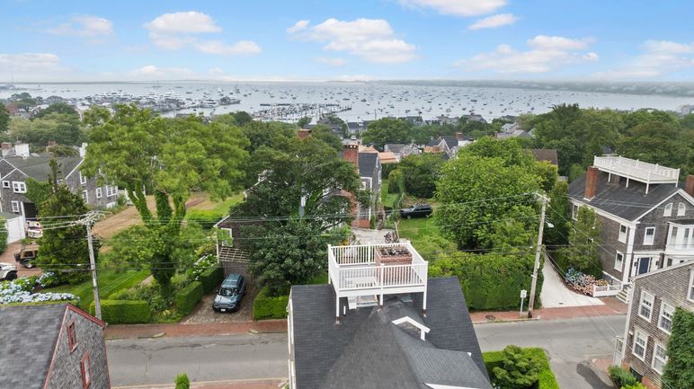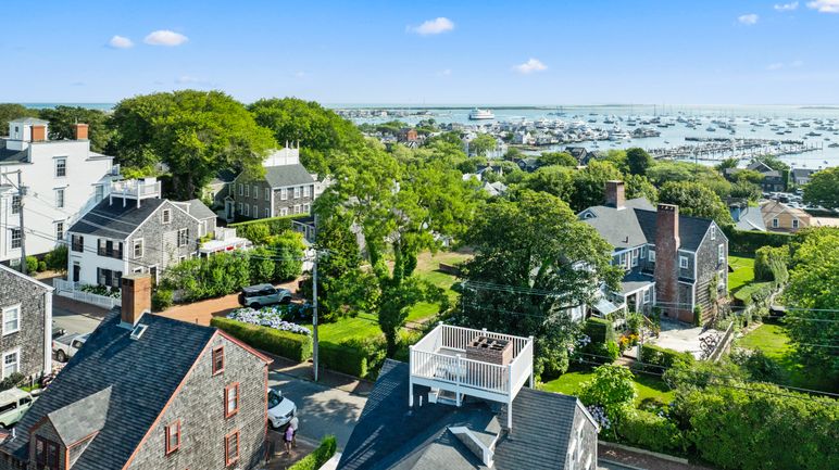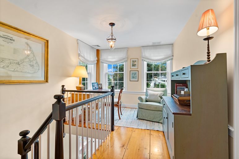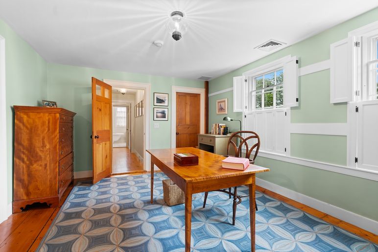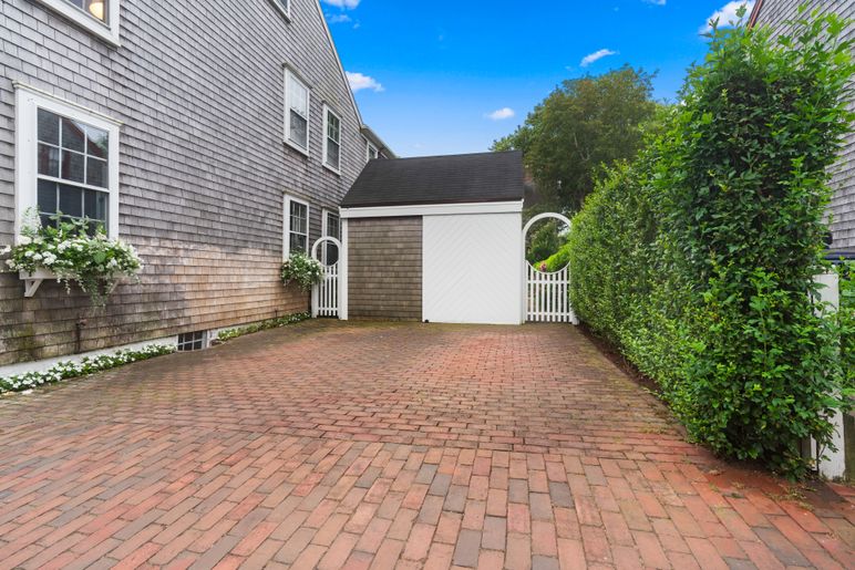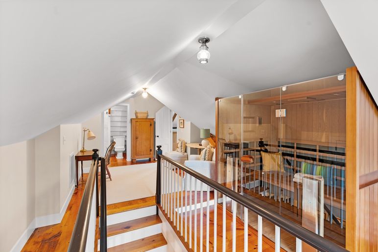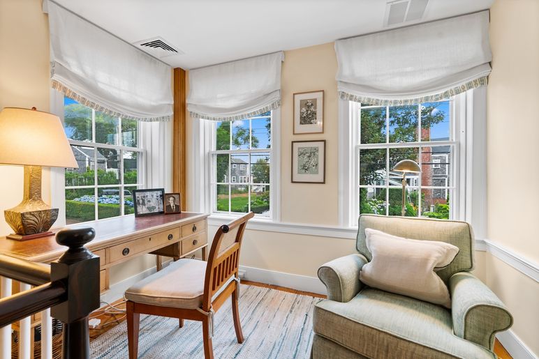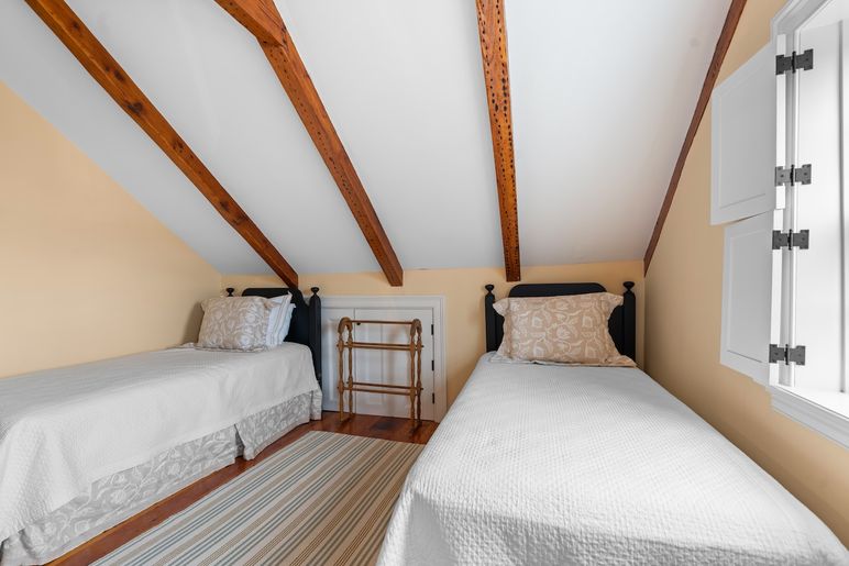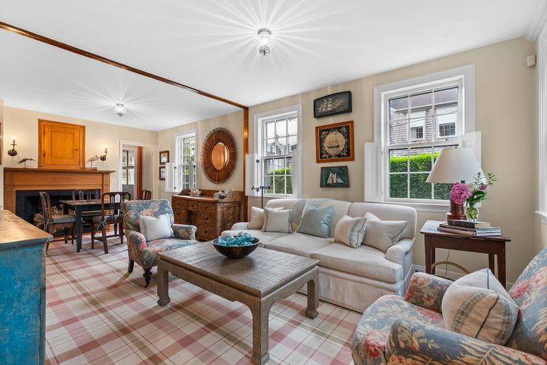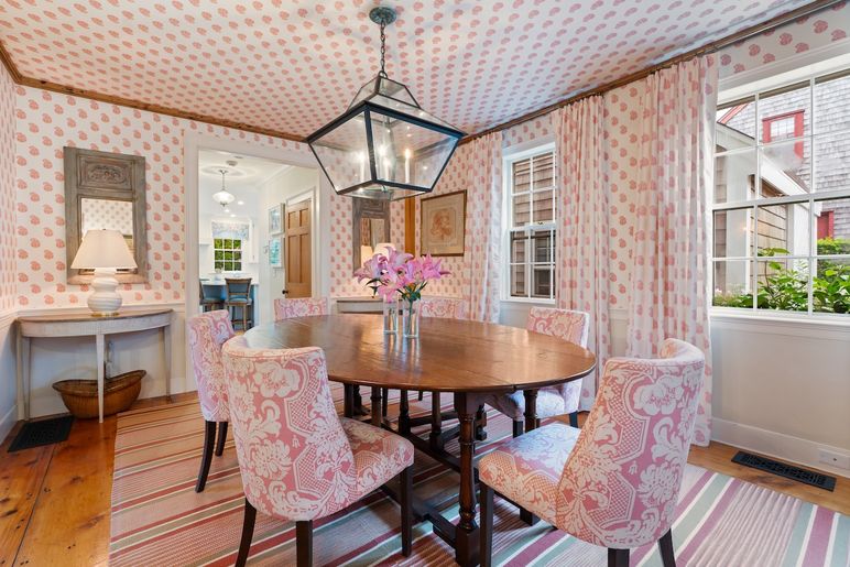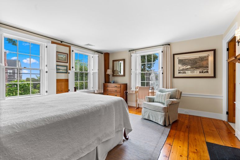 Enter through a gracious foyer that sets the tone with its original woodwork and timeless character. The front parlor offers a cozy place to unwind by the fireplace, while the adjoining second parlor opens to the dining room and modern kitchen — ideal for gathering after a day at the beach. The chef’s kitchen features high-end appliances, a large center island for casual dining, and a built-in bar perfect for entertaining. French doors lead to the private bluestone patio and pergola-shaded dining area surrounded by mature landscaping. A powder room and convenient side entrance complete this level.