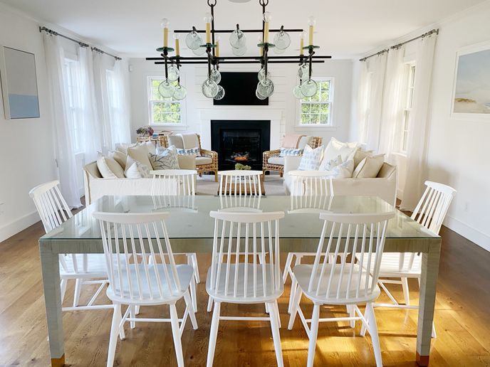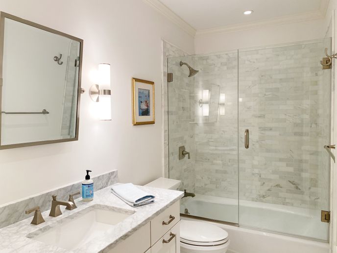 The first floor includes a sun-lit living room with a usable gas fireplace and a TV that is open to the dining and kitchen area. The dining area holds both a dining table that seats 8, as well as an adjoining sitting nook. From there you'll find a spacious, fully equipped kitchen with top-of-the-line appliances. A powder room is also conveniently located on the first floor.