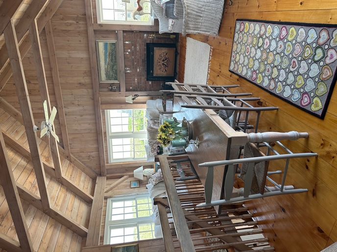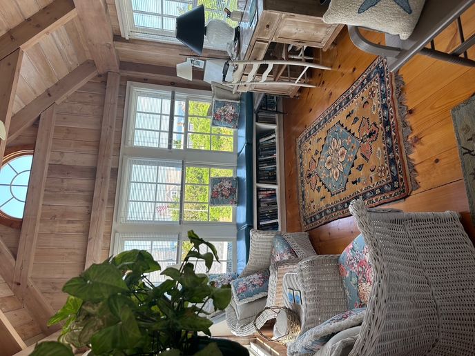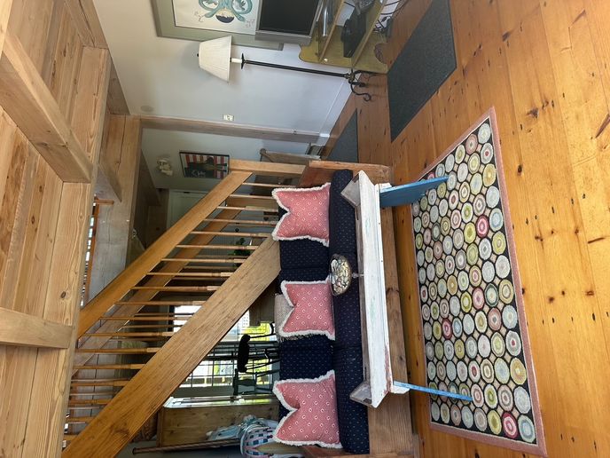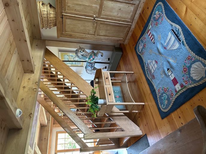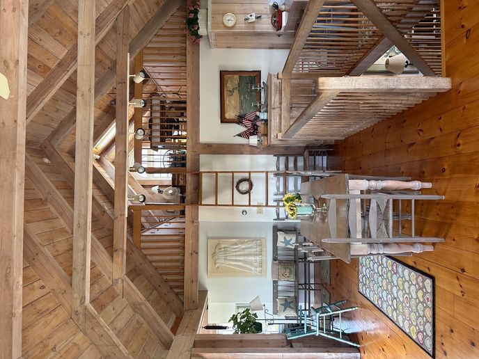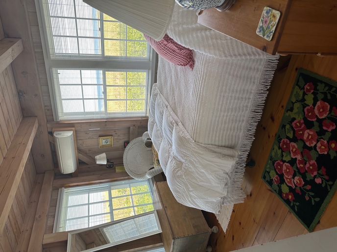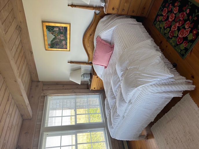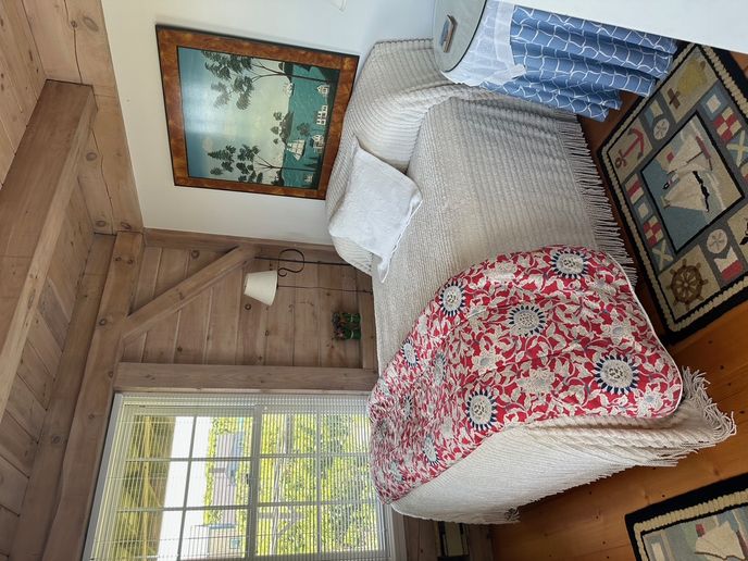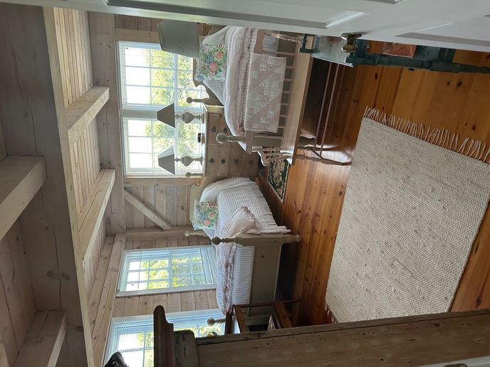 The first floor offers comfortable and functional living with a family room featuring a TV and sliders leading out to a deck, plus French doors that open to the porch. There are three bedrooms: one with twin beds, two with full beds. A bathroom with a tub/shower serves this level, and a laundry room with washer and dryer adds convenience.